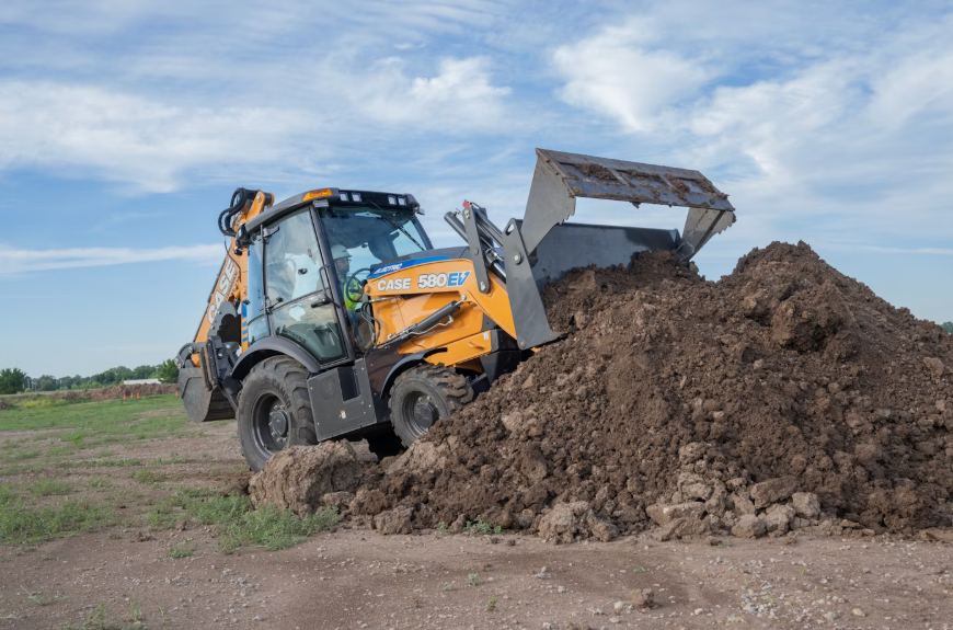 2024 年 8 月,Case 新增的 580EV 成为全球首款商业化电动挖掘装载机。它拥有与柴油版 580 Super N 相同的挖掘和装载性能,单次充电续航可达 8 小时,配备 71 kWh 锂离子电池、两台独立电机、8 英寸触摸屏、电液控制及空调系统。